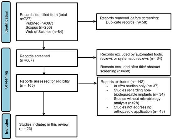 The electronic bibliographic databases of PubMed, Scopus and Web of Science were searched using a combination of MeSH terms and/or keywords in all fields of the research studies, regarding broad domains, such as osteomyelitis, bone fixation device, infection and biodegradable bone implant. For PubMed search, the following query was used: (Bone* OR “Bone and Bones”[Mesh]) AND (“Bone Infection*” OR Osteomyelitis OR “Implant-related Infection*” OR “Implant-associated Infection*” OR “Device-related Infection*” OR “Device-associated Infection*” OR “Bone Diseases, Infectious”[Mesh] OR biofilm*) AND (absorbable OR biodegradable OR bioabsorbable OR “Absorbable Implants”[Mesh] OR “Bioabsorbable Implant*” OR “Biodegradable Implant*” OR “Materials Testing”[Mesh]) AND (Device* OR Implant* OR “Bone-Implant Interface”[Mesh] OR “Fracture Fixation”[Mesh] OR “Osseointegration” OR “Prostheses and Implants”[Mesh] OR “Orthopedic Fixation Devices”[Mesh] OR “Bone Substitutes”[Mesh]). Regarding Scopus and Web of Science the used query was: (Bone* OR “Bone and Bones”) AND (“Bone Infection*” OR Osteomyelitis OR “Implant-related Infection*” OR “Implant-associated Infection*” OR “Device-related Infection*” OR “Device-associated Infection*” OR “Bone Diseases, Infectious” OR biofilm*) AND (absorbable OR biodegradable OR bioabsorbable OR “Absorbable Implants” OR “Bioabsorbable Implant*” OR “Biodegradable Implant*” OR “Materials Testing”) AND (Device* OR Implant* OR “Bone-Implant Interface” OR “Fracture Fixation” OR “Osseointegration” OR “Prostheses and Implants” OR “Orthopedic Fixation Devices” OR “Bone Substitutes”). Studies were selected and screened from January 2014 up to November 2021. The search included all publication types except reviews or systematic reviews and no language restrictions were applied.