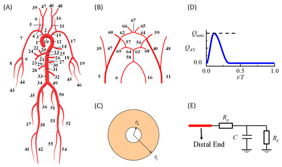 At the inlet of the ascending aorta (segment no. 1 in Figure 1A), a prescribed volumetric flow rate curve was modeled as the boundary condition (Figure 1D), and the area under the curve was equal to the stroke volume. At the distal ends of the arteries, widely used three-element RCR Windkessel models were used to model peripheral vessels (Figure 1E). More details regarding the modeling methods and numerical schemes can be found in the article by Zhang et al. [17]. The default parameters of each artery segment, including the diameter, wall thickness, and elastic modulus, were taken from the literature [24,25].