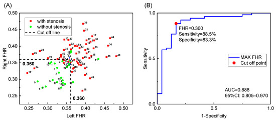 In contrast to the classical indices, the FHR showed a superior diagnostic performance. The t-test results showed a significant difference between the two groups on both sides (p < 0.001). The AUC values of the left and right sides were 0.838 and 0.836, respectively. The best cutoff value for the left FHR was 0.363, with a sensitivity of 70% and a specificity of 91.7%. The best cutoff value for the right FHR was 0.351, with a sensitivity of 76.3% and a specificity of 79.2%.