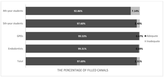 In the current study, the adequate length and density were noted in 85.75% and 99.53% for GPDs, respectively. The lower percentage (70.1%) of the adequate length of root canal filling was found for students of the postgraduate program in endodontics []. This difference could be associated with the different instrumentation and obturation techniques used in RCT in both studies. The inferior results of the mentioned survey could result from the lower number of treated molars in the present study (43.06% vs. 56.2%). In another research study where molars were treated in a group of GPDs, the adequate length and density were noted in 31.3% and 62.7%, respectively []. Interestingly, another study reported 90.3% cases with adequate obturation in the GDPs group []. However, in the present study, the results were similar to those reported by others (length—84.3% and dentistry—98%), where RCT was performed by postgraduate students [,]. These data are in contrast with the results reported in a retrospective study assessing the obturation quality of primary RCTs of molar teeth performed by GPD, where an acceptable quality of root filling was only found in 31.3% []. In contrast, in Saudi Arabia, GPDs performed RCT with adequate length and density in 46.4% and 75.8%, respectively.