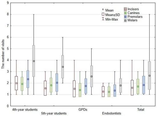 The mean value of visit is presented in Figure 3. The Mann–Whitney U test revealed that endodontists needed statistically significant fewer visits than other groups (p < 0.001). Moreover, GPDs needed statistically significant fewer visits than 4th year students (p < 0.001). The mean number of visits was significantly higher in the mandible (2.12 visits per tooth) than in the maxilla (2.01 visits per tooth) (p < 0.05). One-visit treatment was carried out in 12.04% of cases treated by 4th year students, in 26.15%—by 5th year students, in 32.06%—by GPDs, and in 51.36%—by endodontists.
