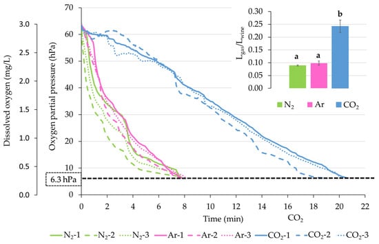 Kinetics of oxygen removal in model wine with the different inerting gases tested. Average of three repetitions were performed with each gas. Different letter in the bar graph indicated statistically significant differences.
