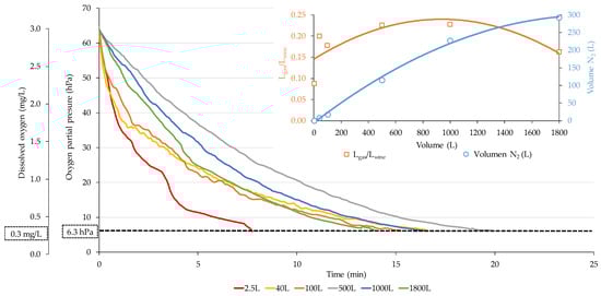 Kinetics of oxygen removal by sparging with N2 in different volumes of model wine. Average of three repetitions were performed with each gas.