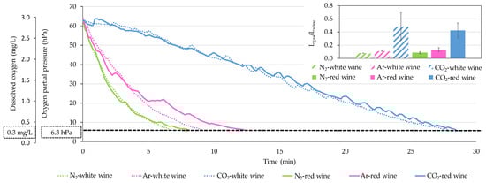Next, other inerting gases, such as CO2 and Ar, were tested in the same volume of model wine and under the same conditions of temperature and flow rate of gas incorporated as in the case of N2, to evaluate their effectiveness as well. Figure 1 shows the kinetics over time for oxygen removal in the model wine with each of the inerting gases used and the volume that had to be applied per liter of wine in each trial (index Lgas/Lwine). As can be seen, the most effective gas for removing oxygen from the model wine up to values of 0.3 mg/L (pO2 = 6.3 hPa) was N2, which was necessary to apply 0.089 L of gas per liter of wine. The volume of Ar required to remove oxygen was similar to that of N2 (0.099 Lgas/Lwine). On the other hand, CO2 showed the worst results because it was necessary to incorporate this gas for a longer time, and therefore, it required significantly more volume to remove oxygen from the wine (0.243 Lgas/Lwine). N2 is the least dense gas of the three gases used, which may explain its greater efficiency in displacing oxygen out of the wine. On the other hand, Ar and CO2 are denser gases and form bigger bubbles than N2, so there is less contact surface between the wine and the gas, and they do not succeed in displacing oxygen from the wine as quickly. As indicated in the literature, the smaller the bubble size, the better sparging results will be obtained precisely because there will be a larger interface between the wine and the gas [21,29,30]. In addition, CO2 has the peculiarity of being highly soluble in wine [19], which is another factor that can affect its effectiveness in displacing oxygen. In contrast, the solubility of N2 is very low or null in wine, but there is some ambiguity in these data depending on the literature consulted, indicating that it is slightly higher than the solubility of oxygen. Finally, it has been suggested that Ar is not soluble in wine [20,31,32]. This low or null solubility of both gases in wine may explain why the results obtained with both gases to displace dissolved oxygen have been very similar.