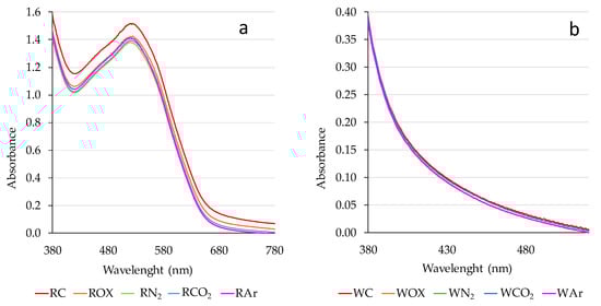 Spectral scan of the different red (a) and white (b) wines studied. White wine control (WC); white wine oxygenated (WOX); white wine sparged with N2 (WN2); white wine sparged with argon (WAr); white wine sparged with CO2 (WCO2). Red wine control (RC); red wine oxygenated (ROX); red wine sparged with N2 (RN2); red wine sparged with argon (RAr); red wine sparged with CO2 (RCO2).
