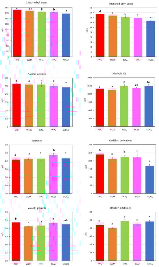 Figure 5 shows the content of the different groups of volatile minority compounds in white wines. Table S1 (Supplementary Material) shows the content of each of the compounds studied. In general, it was seen that the WOX wine and those treated with the inerting gases (WN2, WAr, and WCO2) to remove dissolved oxygen produced a significant loss of linear ethyl esters (EEL) and branched ethyl esters (EEB) with respect to the control wine, mainly due to the loss of hexanoate and ethyl octanoate, which are the majority compounds within the ethyl esters. These compounds are characterized by contributing fruity aromas to wines and have a very low perception threshold (5 and 2 µg/L, respectively) [28,38,41]. Therefore, the oxygenation and sparging treatments had a negative effect on the volatile compounds that contribute fruity notes, either due to their oxidation or their volatilization during sparging. On the other hand, the WAr wine presented a higher terpene content, mainly due to its higher α-Terpineol content. In general, this compound and the other terpene compounds are characterized by providing wines with floral aromas [28,38,39,40], but their content did not exceed the perception threshold. WN2 and WCO2 showed a higher content of C6 alcohols compared to the control wine, but these differences did not affect the potential sensory profile (values below the perception threshold). The wine WCO2 had a lower content of vanillin derivatives than the control wine and the other wines. These compounds are of sensory interest for imparting vanilla aromas to wines [28,38,39,40]. However, their content in the white wines was well below the threshold of perception, so sparging with CO2 had no effect from a sensory point of view. Sparging with N2 and CO2 also affected the Strecker aldehyde content, with these wines showing higher contents than the control wine and the Ar-treated wine. These differences were mainly due to the higher content of 3-methylbutanal and isobutyraldehyde, which were the major compounds within this group. These compounds are formed due to oxidation processes and contribute odors that are considered negative for the sensory profile of wines, such as dried fruit, wet wood, wet paper, etc., when they are above the perception threshold (4.6 and 6 µg/L, respectively) [42]. All wines had content above the threshold. In other words, although these aromas could already be perceived in the control wine, the treatments with N2 and CO2 were able to enhance them. However, perception and enhanced perception were not tested in this study, and there are many suppressing and enhancing effects that can make a compound aroma active, even below the threshold.