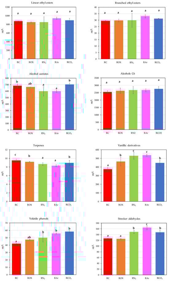 Content of the different groups of volatile minority compounds in the red wines studied. Red wine control (RC); red wine oxygenated (ROX); red wine sparged with N2 (RN2); red wine sparged with argon (RAr); red wine sparged with CO2 (RCO2). Different letters indicate statistically significant differences.