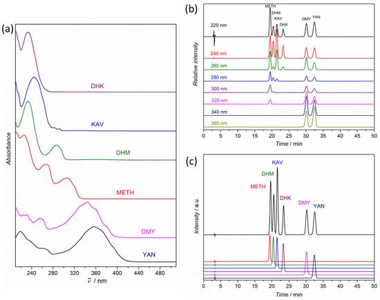 (a) UV spectra of the six major kavalactones in ethanol, (b) chromatograms of a mixture of six major kavalactones recorded at various detector wavelengths, and (c) identifying the order of elution of the six major kavalactones by comparing chromatograms of the kavalactone mixture with those of individual kavalactones.