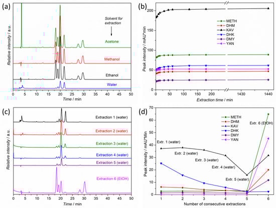 (a) Extraction of a selected commercial kava powder with acetone, methanol, ethanol and water, (b) chromatographic peak intensity vs. extraction time using ethanol as the extractant, and (c,d) five consecutive extractions of a commercial kava powder with water and then with ethanol; (c) chromatograms and (d) chromatographic peak intensity at each consecutive extraction step.