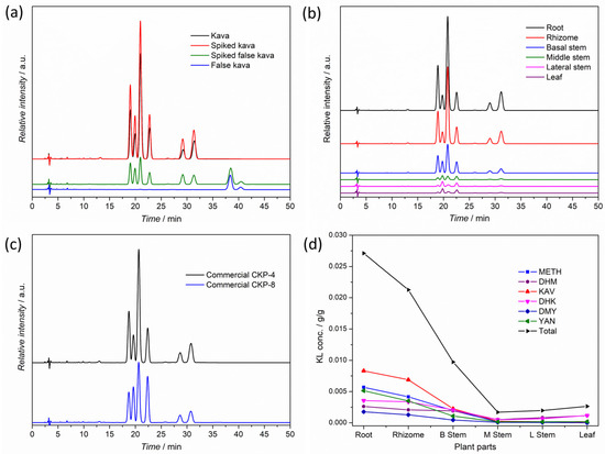 (a) Spiking a commercial kava powder, CKP-1, and the ‘false kava’ powder, (b,d) extraction of various parts of a green kava plant, (c) chromatographic ‘fingerprint’ of CKP-4 and CKP-8, and (d) kavalactone concentration in various parts of a green kava plant (B = basal, M = middle, L = lateral), (see Figure S2 for the freeze-dried plant extraction).