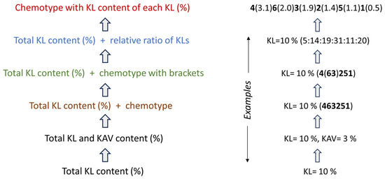 The kava quality is of crucial importance to consumers’ safety. Our KL quantification of kava products sold in the local market highlights the need for quality control and quality assurance due to the KL profile variation in marketed products. It is obvious that kava chemical quality standardization must involve both quantitative and qualitative, namely lactone profile measures. The latter is more crucial for kava drinkers. As a quantitative requirement, Teschke and Lebot [3] suggested that dried kava roots should contain a minimum of 10% KLs, in total, with a minimum of 3% KAV, and dried rhizomes should contain a minimum of 5% total KLs with at least 1% KAV. In addition, the water content should be below 12%. These are important quality requirements; however, further tightening quality control is essential (see, e.g., RB-5b in Table 2, which fulfills these criteria but does not present quality kava for human consumption). The chemotype, in addition to the total lactone content, as introduced by Teschke and Lebot [3], provides a further add-on for quality assurance. The current chemotype code, however, could be further improved. One limitation of the current code is that it does not give information about the relative amount of KLs, only the relative order of their quantity. In addition, it is still not agreed in the scientific community if chemotyping should be based on the mass or the molar amounts of lactones; however, the two could be different if two KL concentrations are close to each other (see Table 1, Table 2 and Table 3). For minor improvements, we suggest that brackets should be used in the code for highlighting a comparable amount of KLs, e.g., within 10%. The further possible development for providing chemical quality information is to use the relative ratio of KLs. The chemotype can easily be derived from this, and, together with the total KL content, full chemical information can be provided. A simpler variant of this chemical code is the lactone code, with the amount of the lactone in parenthesis. The suggested quality code hierarchy, which may be used by kava producers, is shown in Figure 5.