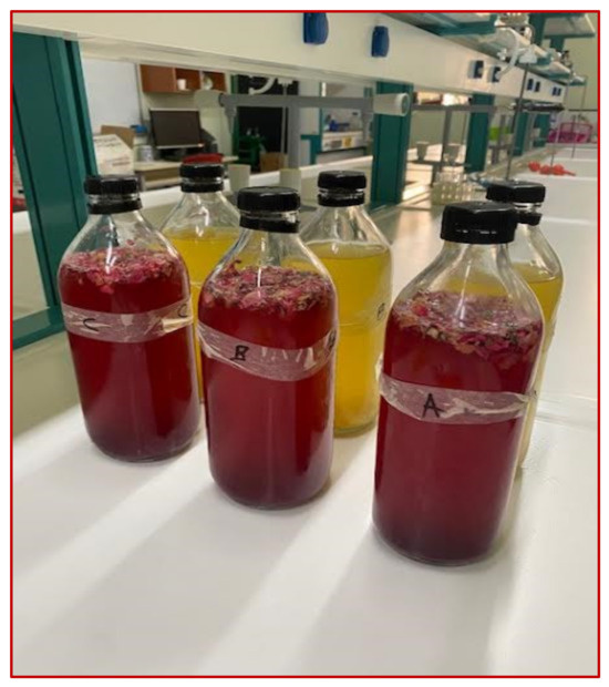 The proposed recipe for KG was 0.3% fresh ginger, 0.15% lemon zest, 0.04% lemon juice, and 0.01% ground turmeric, and for KR, it was 0.25% ground hibiscus calyces, 0.2% rose petals, and 0.05% lavender blossoms. After the addition of these ingredients, the drinks were bottled in the refrigerator for 48 h. Then, filtration and re-bottling were performed (AG, BG, and CG samples for KG; AR, BR, and CR samples for KR).