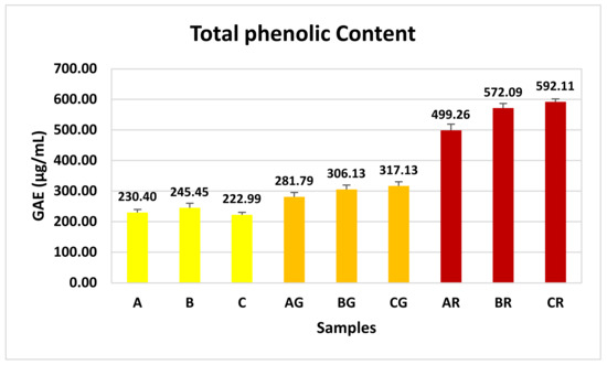 Total phenolic content in kombucha samples before (A, B, C) and after enrichment (AG, BG, CG, AR, BR, CR). Results are reported as mean ± standard deviation in gallic acid equivalents (GAE) of three independent measurements.