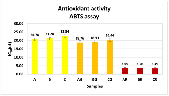 Antioxidant activity was evaluated by the ABTS assay before (A, B, C) and after enrichment (AG, BG, CG, AR, BR, CR). Data are presented as mean ± standard deviation in the amount (μL) required for 50% scavenging of ABTS●+ (IC50) for three independent measurements.