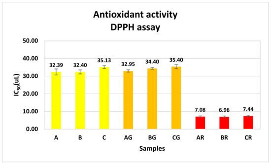 Antioxidant activity based on DPPH assay in samples before (A, B, C) and after enrichment (AG, BG, CG, AR, BR, CR). Data are presented as mean ± standard deviation in the amount (μL) required for 50% scavenging of DPPH● (IC50) for three independent measurements.