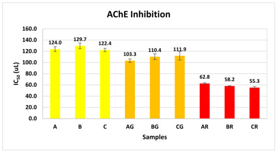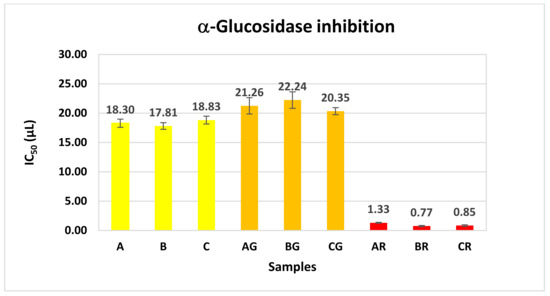 α-Glucosidase inhibition from samples before (A, B, C) and after (AG, BG, CG, AR, BR, CR) enrichment. Data are presented as mean ± standard deviation in the amounts (μL) required for 50% inhibition of α-glucosidase for three independent measurements.