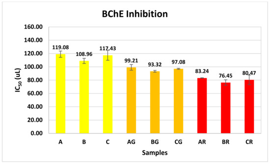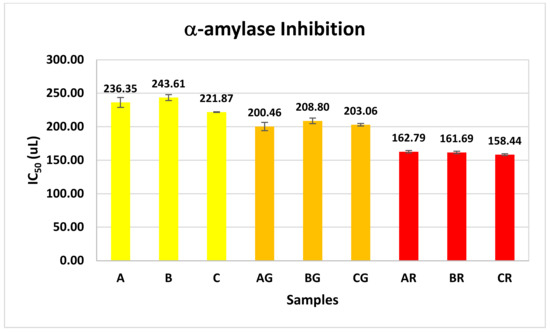 In a previous study, it was shown that cold maceration is optimal for preserving anthocyanins and that a strong correlation was observed between the IC50 values of a cold-macerated tea preparation and its content of delphinidin (R2 = 0.996, p < 0.05) [76]. Those results demonstrated the advantage of cold extraction methods in preparing hibiscus tea as a hypoglycemic agent. So, it can be assumed that optimum results were achieved in our study regarding anthocyanins in the kombucha fermented beverage after the addition of herbs for 48 h at low temperatures. The α-amylase IC50 values are shown in Figure 7. The IC50 values in all the samples after the enrichment (AG, BG, CG, AR, BR, CR) exhibited a decrease (p < 0.05), and therefore, the α-amylase inhibitory activity increased.