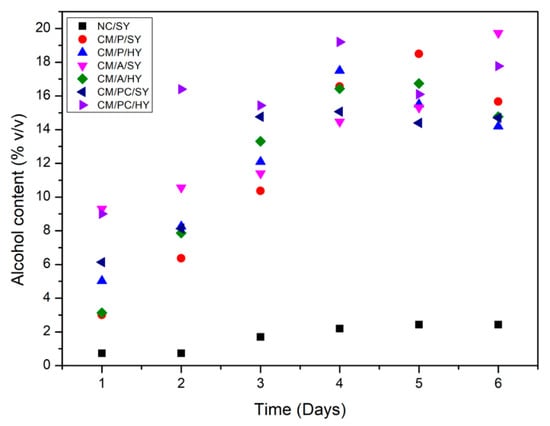 Figure 1 shows the alcohol content of the treatments over six days of fermentation. Notably, the NC/SY treatment demonstrated the lowest alcohol content compared to the other treatments (Figure 2). This observation can be attributed to the fact that this treatment was not subjected to the chaptalization process. The initial soluble solids content was low (2.5 °Brix). It is worth mentioning that the soluble solids content is a measurement that reflects the amount of sugars and other soluble compounds in a liquid. Therefore, higher soluble solids content implies a greater quantity of sugars available for fermentation [26].