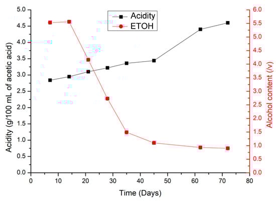 The production of fermented acetic beverages was monitored for 10 weeks, and over this period, the concentration of organic acids, mainly acetic acid, significantly increased (Figure 2). This increase in acetic acid gives the fermented acetic acid a characteristic flavor and inhibits the growth of undesirable or pathogenic microorganisms due to its high acidity [33]. During the fermentation process, a reduction in alcohol content was observed from 5.9 ± 0.3 (% v/v) to 0.46 ± 0.05 (% v/v). This type of acetic fermentation, known as the slow method, occurs when acetic bacteria convert ethanol into acetic acid, which is catalyzed by an enzyme family called acetobacteraceae that catalyzes the oxidation reaction of ethanol into acetic acid [34].