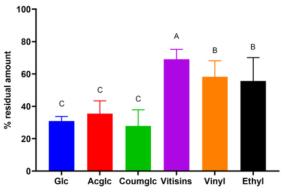 To investigate the overall stability of anthocyanins against oxidation, they were quantified by HPLC and grouped into six main families, including both native compounds (glucosides, acetylglucosides, and coumaroylglucosides) and their derivatives (vitisins, vinylphenol, and ethyl-bridged adducts). Table S2 details the compounds included in each family. Figure 3 shows the residual amount of each chemical class after 20 days of simulated oxidation (as a mean percentage of the entire sample set, independently of the anthocyanin/tannin ratio). Table S3 provides the significant differences among the families at each sampling point during the storage of the solutions. All of these classes proved to be oxidized in the long term, but the derived pigments were significantly more stable than monomeric anthocyanins. In fact, while the latter degraded by up to about 75%, vitisins and the other derivatives only lost, on average, 30–45% of their initial content. Pyranoanthocyanins’ (vitisin A, vitisin B, and vinyl adducts) stability has been claimed to be due to the presence of pyran rings at positions 4 and 5 of the anthocyanin skeleton, which enhances their resistance to nucleophilic attacks [33,34]. In wines, vitisins’ slow degradation may result from their contextual formation during aging due to the interaction between pyruvic acid and key pigments, such as malvidin-3-glucoside and malvidin-3-acetylglucoside [11].