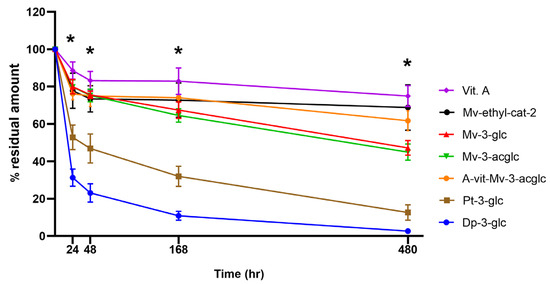 Our data, indeed, suggest that it was clearly more stable than the other o-diphenolic anthocyanins but declined faster than Mv-3-glc and Pn-3-glc, as already found in grape must by Cheynier et al. [40]. As previously mentioned for Figure 3, pigment derivatives, particularly vitisin A and one of the four isomers of Mv-ethyl-bridge adducts, were the least sensitive to oxidation, in agreement with other research [11,33,36].