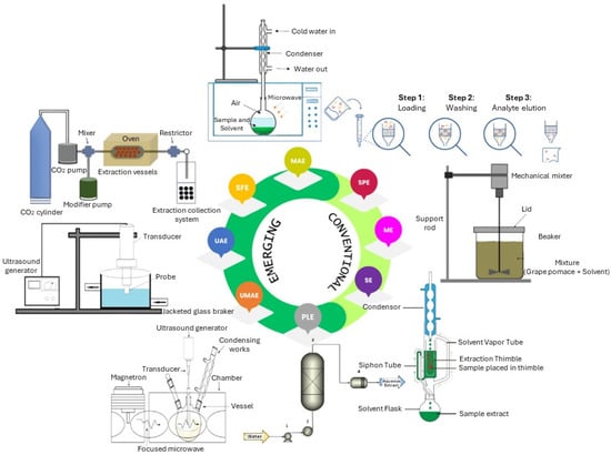 Conventional and emerging extraction techniques are used to recover value-added compounds from grape pomace. MAE—microwave-assisted extraction; ME—maceration; SE—Sohxlet; PLE—pressurized liquid extraction; SPE—solid phase extraction; SFE—supercritical fluid extraction; UAE—ultrasound-assisted extraction; UMAE—ultrasound–microwave-assisted extraction.