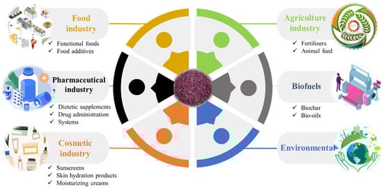 The growing attention to grape pomace, the most important by-product of wineries, is mainly due to the bioactivity of the high-value-added compounds, including phenolic compounds, flavonoids, anthocyanins, volatile organic compounds (VOCs), minerals, fibers, hemicellulose, as well as their potential application various industrial sectors, such as pharmaceuticals, cosmetics, nutraceuticals, agriculture, livestock, and in energy recovery systems, Figure 4 [12,39,40,41,42]. However, in the current review, only industrial food applications will be discussed.