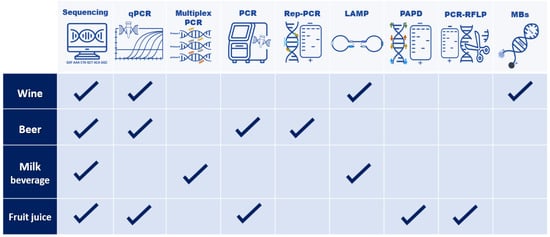 Table 1 summarizes information from the available literature and publications showing primer sequences used to identify pathogenic microorganisms in beer, wine, juice, and milk beverages.