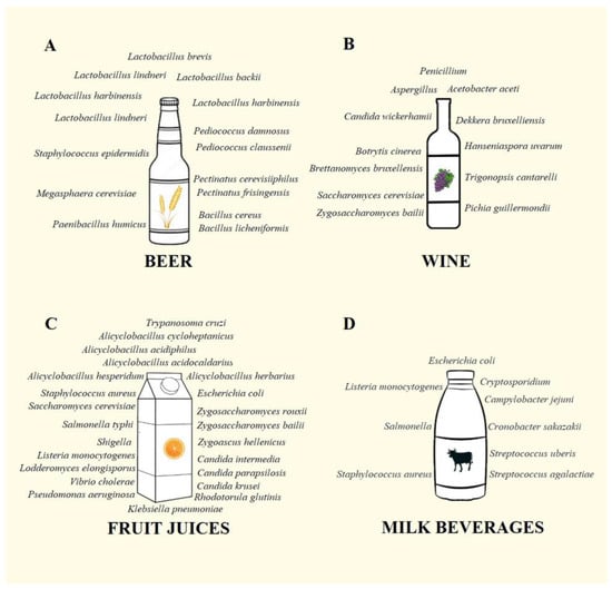 The main microbiological pollutants of beverages. (A) beer, (B) wine, (C) fruit juices, (D) milk beverages.