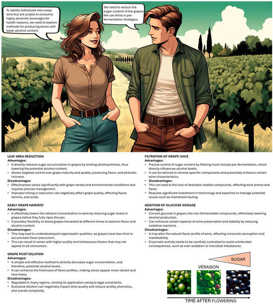 Narrative reviews are powerful tools for disseminating complex information across a broad spectrum of audiences, including scientists dedicated to viticulture and enology research, educators and students involved in these fields, policymakers shaping industry standards, and wine producers adjusting to market demands and climatic realities. The utility of narrative reviews lies in their ability to compile and synthesize extensive research into coherent stories, highlighting gaps, controversies, and consensus within the literature [11,12]. To be effective, especially in a multidisciplinary context, narrative reviews should be written in a language that is accessible to non-specialists [12]. This approach not only facilitates the dissemination of knowledge but also ensures that reviews can effectively contribute to the advancement of practice and research [12]. A clear and understandable prose expands the reach and impact of scientific findings, ensuring that stakeholders at all levels can make informed decisions based on the latest evidence. This review is prompted by the pressing concerns regarding rising alcohol levels in wine due to climate change and attendant health repercussions. By evaluating the current methods for wine alcohol reduction and their efficacy, this review endeavors to provide a comprehensive survey of the domain. It seeks to bridge the knowledge gap for a diverse readership, fostering a holistic comprehension that promotes informed decision-making and encourages further research into sustainable and health-focused winemaking practices. In this paper, it was not only used as an accessible language but also incorporated illustrations reminiscent of comic strips to enhance the effectiveness of the document as a communication tool. Comics and illustrations are crucial in narrative reviews because of their historical significance, educational value, and unique narrative structures. They serve as a hybrid art form that can express complex ideas and emotions while also being accessible and engaging to a wide audience. The interplay of visual and textual elements in comics provides a rich and immersive experience, making them an important subject of academic study and cultural appreciation [13].