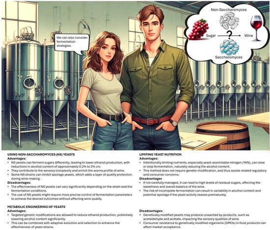 Various innovative fermentation techniques have been developed to produce wines with reduced alcohol content, with a focus mainly on yeast management. These methods include using different yeast strains and genetically engineered yeasts and adjusting the nutritional intake of the yeast during fermentation. Employing non-Saccharomyces (NS) yeasts, using genetically modified yeasts through metabolic engineering, and controlling yeast nutrition are effective strategies for reducing alcohol levels in wines. Each approach has its unique benefits and challenges, significantly influencing the fermentation process, sensory characteristics of the wine, and overall alcohol content (Figure 2) [23].