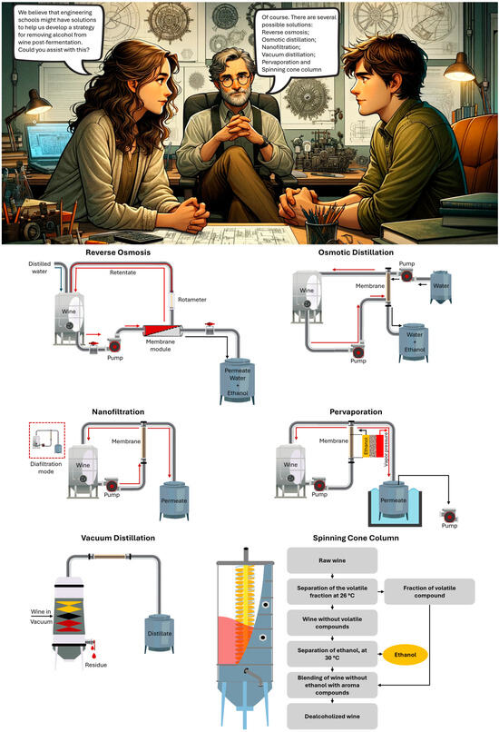 Post-fermentation strategies to reduce the wine alcohol content. (Artificial intelligence and Adobe Illustrator were used to produce the elements depicted in this image).