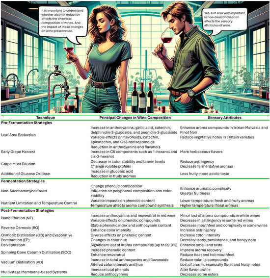 Principal changes in wine composition and sensory attributes after the application of different techniques to reduce alcohol content of the wine. (Artificial intelligence and Adobe Illustrator were used to produce the elements depicted in this image).
