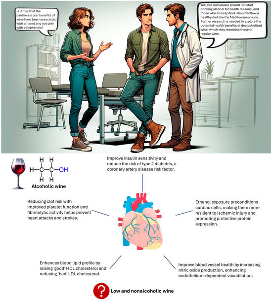 Cardiovascular benefits attributed to wine ethanol. (Artificial intelligence and Adobe Illustrator were used to produce the elements depicted in this image).