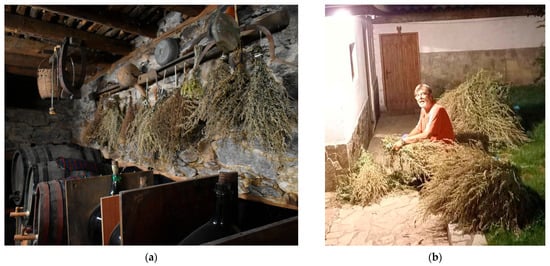 The herbage of most of the used plants is gathered and dried in the shade, tied in bunches (kitki), the latter being the principal measuring unit in the recipes (Figure 1). A bunch can be small (15–20 g) and “normal” (approx. 30 g). In the presented recipes, A. vulgaris was applied in the biggest quantities. On average 25 “normal” bunches of A. vulgaris, together with the other herbal ingredients, occupied about half to two thirds of the barrel volume. Interestingly, the recipe of the oldest participant did not include locally gathered A. vulgaris which might imply that its use is a recipe development that spread among pelin makers in the village to avoid the difficulty of collecting the necessary quantities in some years, as some producers pointed out.