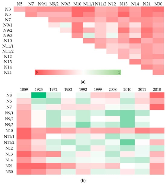 Similarity matrix (Jaccard index) of different preparations of Zmeyovski pelin (a); compared to previously published data on Bulgarian pelin, in chronological order (b). Numbers in the Zmeyovski pelin codes (Nxx) indicate the number of plant taxa in each blend. Literature data sources: 1859 [], 1925 [], 1972 [], 1982 [], 1992 [], 1999 [], 2008 [], 2010 [], 2011 [], 2018 [].