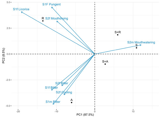Figure 1 shows a biplot from the principal component analysis (PCA) of the significant attributes from RR. The first two principal components explain 97% of total variance. Differences between the sucrose treatment vs. the partial and complete sucrose-replaced treatments described most of the variability (87.5%), as displayed in principal component 1. Differences between sweetener systems were described (8.5%) by principal component 2. The attributes licorice and pungent flavor together with mouth-drying mouthfeel were mostly associated with the R treatment, whereas the bitter taste from the different phases and cooling mouthfeel were primarily associated with treatment A. Consistent with the results from the Dunnett’s test, the partially sucrose-replaced treatments were more associated with the sucrose control (S).