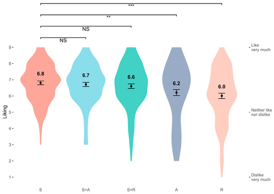 Figure 2. Violin plot with mean and std. error of liking ratings from all consumers. Treatments are sucrose (S), sucrose and ace-K (S+A), sucrose and reb M (S+R), ace-K (A) and reb M (R). Significant differences between means of the sucrose treatment and sucrose-replaced treatments are indicated with lines above the plot with asterisk: non-significant (NS) = p > 0.05, ** = p < 0.01, and *** = p < 0.001.