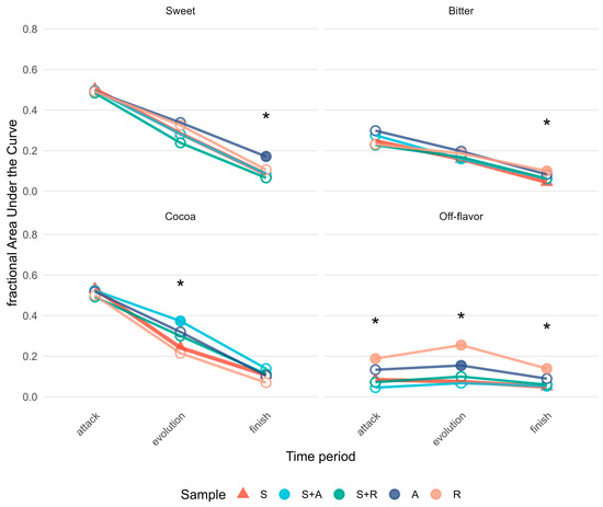 Figure 3. Citation proportions of all attributes in the time periods attack, evolution, and finish considering all consumers. Asterisks (*) indicate time periods with significant differences between sucrose and sucrose-replaced treatments, and significant differences (p < 0.05) in Dunnett’s test are marked with filled points. Treatments are sucrose (S), sucrose and ace-K (S+A), sucrose and reb M (S+R), ace-K (A) and reb M (R).