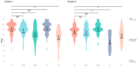 Figure 4. Violin plots with mean and std. error of liking ratings from cluster 1 and 2. Treatments are sucrose (S), sucrose and ace-K (S+A), sucrose and reb M (S+R), ace-K (A) and reb M (R). Significant differences between means of the sucrose treatment and sucrose-replaced treatments are indicated with lines above the plot with asterisk: non-significant (NS) = p > 0.05, ** = p < 0.01, and *** = p < 0.001.