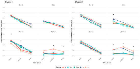 Figure 5. Citation proportions of the attributes in the periods attack, evolution and finish between cluster 1 and 2. Asterisks (*) indicate time periods with significant differences between sucrose and sucrose-replaced treatments, and significant differences (p < 0.05) in Dunnett’s test are marked with filled points. Treatments are sucrose (S), sucrose and ace-K (S+A), sucrose and reb M (S+R), ace-K (A) and reb M (R).