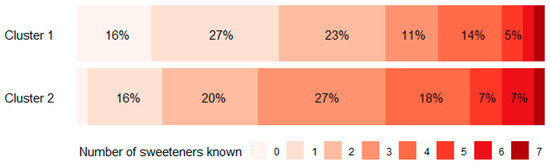 Figure 6 shows the percentage of consumers within each cluster, categorized by number of known sweeteners. Consumers in cluster 2 were found to be acquainted with a higher number of NNS compared to cluster 1. The number of consumers acquainted with 3–6 different NNS was higher in cluster 2, whereas in cluster 1, acquaintance with 0–2 NNS was more frequent.