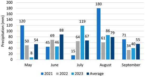The coolest months of the vegetation period in the experimental years were May and September, during which night frosts also occurred (Figure 1). In 2021, June and July experienced high temperatures; however, August and September were cooler than they were, on average, in previous years. In this year, May and August were rainy months (Figure 2). In June, the precipitation was below average, followed by drought in July. The year 2022 had a warmer August compared to other years, but a very cool September followed. Precipitation was more evenly distributed, with September being the driest month. In 2023, August was warmer than it had been, on average, for many years, and September was exceptionally warm. The drought occurred in spring in May, while rainfall in July was higher than it was in the other experimental years.