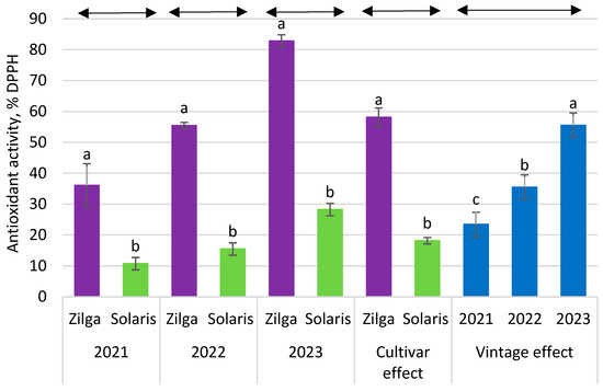 Antioxidant activity of DPPH radical scavenging (%) of the skin-contact fermented wines of ‘Solaris’ and ‘Zilga’. Different letters on the bars indicate statistically significant differences (p < 0.05).