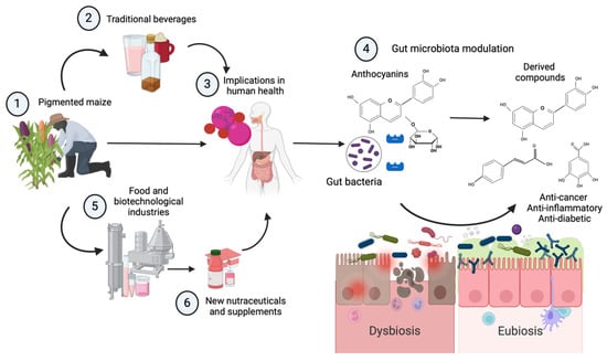 Pigmented maize is harvested in Mesoamerica and other regions (1) and has been used for the preparation of traditional beverages (2) from the southeastern and western zones in Mexico. Especially used on festive occasions, these beverages are fermented with Enterobacteriaceae and various lactic acid bacteria (i.e., tejuino and pozol). One of the important bioactive agents of these beverages from pigmented maize are anthocyanins (3), one group of vegetal dyes with implications in human health. One of the most important is the intestinal effect on the intestinal barrier (4) and specifically on the microbiota protecting the intestinal lumen. Here, several bacteria use anthocyanins (3), fermenting them through gut enzymes (cyanidin-3 glucoside to phenolic acids and polyphenolic metabolites) and increasing their immunomodulatory, anti-inflammatory, anti-cancer, and anti-diabetic effects, and even in the aglycone form, they have also shown strong antioxidant effects. This is why the food and biotechnological industries (5) have developed methods that can be used in the production, fortification, and re-formulation of new nutraceuticals (6) and supplements with specific effects on nutrition and health. Created on BioRender.com (2024) (accessed on 28 June 2024).