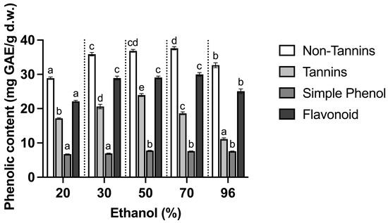 Effect of ethanol content on the content of phenolic constituents in the willow infusions. Different letters (a–e) for each constituent indicate significant differences (p < 0.05).