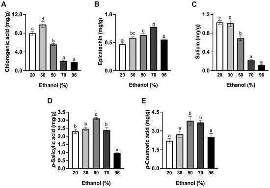 Effect of ethanol content on the content of phenolic compounds: chlorogenic acid (A), epicatechin (B), salicin (C), p-salicylic acid (D), and p-coumaric acid (E) in the willow infusions. Different letters (a–d) indicate significant differences (p < 0.05).