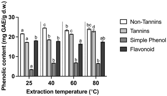 Figure 3 shows that the phenolic constituents were significantly influenced by extraction temperature (p < 0.05). NT content increased significantly with an increase in temperature from 25 °C to 40 °C (p < 0.05). A further increase in temperature from 40 °C to 60 °C resulted in a significant decrease in NT (p < 0.05); however, the NT content at 80 °C was not significantly different from the infusion at 40 °C or 60 °C (p 0.05). In contrast to NT, an increase in temperature promotes the release of TT, leading to a higher yield. Kemppainen et al. [43] also found high extraction temperature increased the tannin yield extracted from spruce bark. SP content increased significantly with extraction temperature from 25 °C to 40 °C, and a further increase in temperature did not result in a significant change in SP (p 0.05). There was no significant difference in the flavonoid content between 25 °C, 40 °C, and 80 °C (p 0.05), but a significant decrease was observed at 60 °C in comparison with infusions prepared at 25 °C or 40 °C (p < 0.05).
