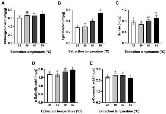 As shown in Figure 4, the majority of phenolic compounds tended to increase with an increase in extraction temperature up to 80 °C. Chlorogenic acid was significantly lower at 25 °C than at 80 °C (p < 0.05). Epicatechin was not significantly affected by extraction temperature between 25 °C and 40 °C (p 0.05), but it was significantly increased from 40 °C to 80 °C (p < 0.05). There was a significant increase in salicin and p-salicylic acid content between 25 °C and 80 °C (p < 0.05). However, the increase in temperature did not significantly impact the extraction of p-coumaric acid (p 0.05).