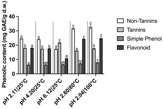 As shown in Figure 5, the TT content was higher in the infusions at pH 6.12 than those of acidic and/or hot aqueous infusions, and the lowest TT content was found in the infusions at pH 2.6 and 80 °C (p < 0.05), which indicates extraction under acidic conditions may affect the recovery of TTs from willow bark. A similar observation was reported by Shahidi and Naczk [49], where the addition of 1% HCl reduced the recovery of tannins from rapeseed. At acidic pHs, tannins tend to form insoluble precipitates due to tannin self-condensation reaction, thus affecting the extraction efficiency [50]. Moreover, hydrolysable tannins are thought to be disassociated and broken into simple phenols at acidic conditions and high extraction temperatures.